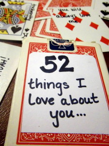 4. Homemade gifts: Give a gift from the heart this year with something made by your own two hands. Does your daughter love cooking? Make her a personalized book of your favorite recipes from over the years. Dad travels for work? Record yourself reading him a story or playing an instrument, for on-the-road entertainment. Are you creative? Write a poem or paint a picture and frame it to match the recipients décor. Visit Pinterest or Etsy for great ideas for homemade gifts and crafts. Last year for Valentine’s Day, I gave my husband a deck of cards with one thing I loved about him written on each card. Don’t wait until February to tell your special one “52 Reasons I Love You.”