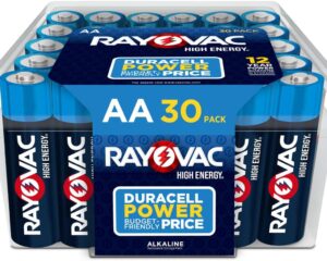 Clip the 35% off coupon and check out via Subscribe & Save to get the Rayovac AA Alkaline Batteries, 30 Count for only $7.98. 30 pack of Rayovac High Energy AA Batteries Long-lasting power for high use devices Ideal as flashlight batteries and in other high use devices, including wireless mice, remotes and toys 12 Year Power Guarantee in Storage�These double A batteries hold power