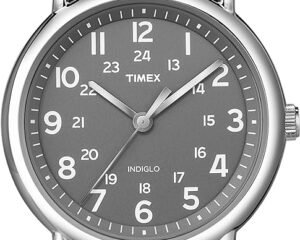 Lowest price ever on the Timex Unisex T2N647 Weekender 38mm in Gray/Orange stripe. Click here to get it for only $25.99. Adjustable gray & orange striped 20mm nylon slip-thru strap fits up to 8-inch wrist circumference Gray dial with full Arabic numerals; 24-hour military time Silver-tone 38mm brass case with mineral glass crystal Indiglo light-up watch dial Water resistant to 30m (100ft): in general, withstands