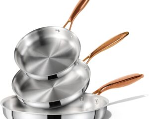 This is an amazing deal for a set of tri-ply cookware. Click here to get the CAROTE 8″+10″ +12″ Tri-Ply Stainless Steel Frying Pan Set for only $39.99! 【Healthy Materials】Made from 18/8 stainless steel with a three-layer structure, free from any chemicals, it does not react adversely with food, is durable and sturdy, and is non-toxic and healthy; the interior features a thick aluminum core