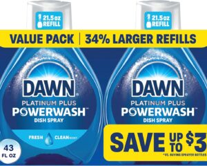 Clip the 25% off coupon and check out via Subscribe & Save to get the Dawn Powerwash Fresh Dish Spray, 2 Refills, 43 Fl Oz for only $6.95. 1. GREASE AND GRIME FIGHTER: This dish soap liquid fights 99% of grease and grime in half the time *vs. leading competitive brands ultra-strength formula on a representative meal for two, 5X FASTER* Grease Cleaning (*vs. Dawn