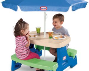 Save 42% off the Little Tikes Easy Store Jr. Picnic Table with Umbrella! Get it now for only $44.54. Sized right for younger children, this indoor/outdoor plastic picnic table unlocks and folds for portability and storage Stylish umbrella provides UV protection during picnic time No tools are required to set it up or take it down Seats up to 4 children ; Max Weight: 50