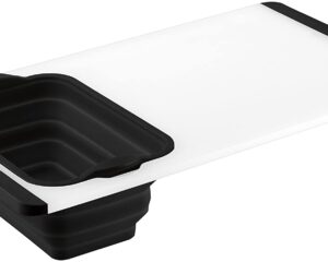 Designed with nonslip silicone edges for easy handling, this chef-caliber, 20″ cutting board measures up to just about any cutting task and fits over the sink to conserve counter space. Equipped with a 2.5-Quart removable, collapsible colander, the polyboard is easy to clean and dishwasher safe. It is perfect for cutting meats, fish, vegetables, and fruits, with a built-in colander that lets you rinse and