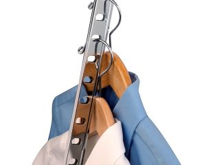 These are so helpful! Honey-Can-Do HNG-01519 Over The Door Hanger Holder, Folding. Offering ten slots for clothing hangers. Now you can hang damp or freshly pressed clothing on the versatile over-the-door hanger holder. Over the Door Hanger Holder Features Sturdy steel construction with a polished chrome finish. Over the door hook has a felt soft felt lining to protect door surface. Rubber coated tip prevents