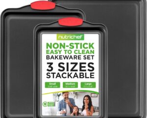 Save 50% off the NutriChef 3-Piece Nonstick Kitchen Oven Baking Pans! Click here to get them for only $16.99. 3-PIECE SET: NutriChef 3-piece nonstick cookware set includes the small, medium, and large size of cookie pans. These are a flexible, stylish, and non-stick carbon steel bakeware set with red silicone handles NON-STICK COATING: The PTFE/PFOA/PFOS-free non-stick pot set cooking ware features a long-lasting nonstick coating
