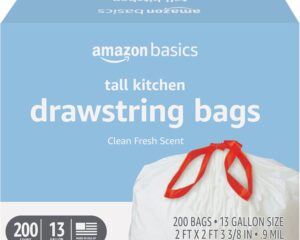 Clip the 15% off coupon and check out via Subscribe & Save to get the Amazon Basics Scented Trash Bags, 13 Gallon, 200 Count for only $14.44. DURABLE STRENGTH: Crafted with 0.9 mil thickness, these sturdy 13-gallon kitchen trash bags withstand daily kitchen demands without tearing SPACIOUS CAPACITY: With a spacious size, our 13-gallon drawstring trash bags provide ample room for waste, making it easy