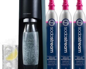 Lowest price ever on the SodaStream Terra Sparkling Water Maker Bundle in Black! Get it now for only $89.99. WHAT IS IN THE CARBONATION BUNDLE: (1) SodaStream Terra Sparkling water maker in black color, (3) 60L Co2 cylinders, and (1) 1L BPA-Free Dishwasher safe reusable carbonating bottle SODASTREAM TERRA: SodaStream’s best-selling Sparkling Water Maker. Turn plain water into fresh sparkling water in seconds. Designed for