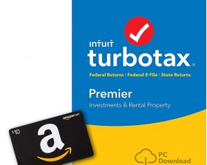 Get ready for a financially responsible New Year with this bundle. Get the TurboTax Premier + State 2018 Tax Software [PC Download] [Amazon Exclusive] for only $54.99 and get a free $10 Amazon Gift Card as a bonus! TurboTax Premier is recommended if you sold stocks, bonds, mutual funds or options for an employee stock purchase plan, own rental property or you are the beneficiary of an estate