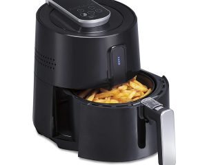 Make delicious, crisp food with the Hamilton Beach Air Fryer. This 2.5 liter fryer uses air and little to no oil to cook all your favorites, from French fries to steak. Cook on manual mode or choose from one of 6 pre-programmed settings for crisp French fries, chicken, seafood, steak, baked goods, and veggies. When your food is ready, the nonstick cooking basket is removable