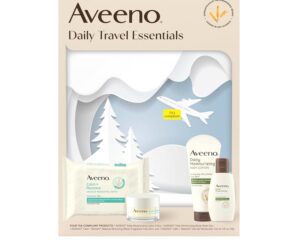 Save 52% off the Aveeno Daily Travel Essentials Gift Set. Hurry and grab it for only $6.84. The Aveeno Daily Travel Essentials Skin Care Kit features four TSA-compliant travel-size must-haves including body lotion, body wash, makeup remover wipes, and a hydrating gel facial moisturizer all in one convenient, on-the-go set The Calm + Restore Makeup Remover Wipes are formulated with soothing oat extract and calming