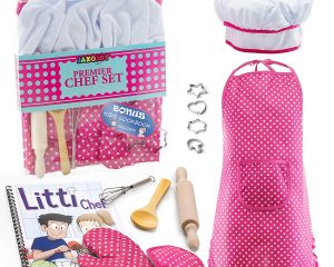 How cute is this? The PREMIER CHEF SET includes everything you need for your little one to start their adventures in the kitchen.The apron and chef hat are adjustable with a neck and waist band to the apron and an elastic band to the chef hat, so it will have a perfect fit. Get the 11 piece JaxoJoy Complete Kids Cooking and Baking Set for only $12.49 right