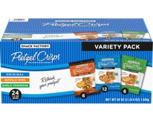Clip the 20% off coupon and check out via Subscribe & Save to get the Snack Factory Pretzel Crisps Variety Pack, (Pack of 24) for only $12.66. PRETZEL VARIETY PACK: A selection of our most popular flavors: Original (12), Buffalo Wing (6), Garlic Parmesan (6) BAKED SNACK: The best part of pretzels – thin and flavorful with the crunch you love ORIGINAL FLAVOR: Perfectly salted