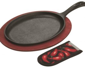Lowest price ever on the Lodge Pre-Seasoned Cast Iron Fajita Set! Get it right now for only $13.16. This would make such a fun gift! Cast-iron surface conducts heat better than other materials; surface grows more stick-resistant with use Decorative chili-pepper handle mitt protects hands from hot temperatures Preseasoned to prevent food from sticking (though coating first with oil or spray is recommended) Includes 10-by-7-inch oval