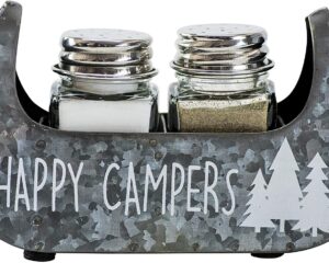 Boston Warehouse glass Salt & Pepper Shakers in a galvanized canoe shaped holder are a perfect addition to your home and a wonderful gift for anyone! Enhance your kitchen and add a touch of whimsy with this adorable 3-Piece set. Handwashing is recommended. Look for more creative ideas for your home and kitchen from Boston Warehouse. Get this adorable Boston Warehouse Happy Campers Salt &