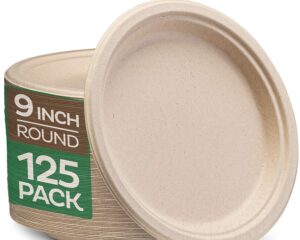 100% Compostable 9 Inch Paper Plates [125-Pack] Heavy-Duty Plate, Natural Disposable Bagasse Plate, Eco-Friendly Made of Sugarcane Fibers – Natural Unbleached Brown 9″ Biodegradable Plate by Stack Man $12.98