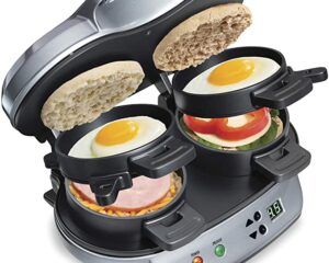 Save on Hamilton Beach Specialty Electronics Today! Get a waffle maker, a single-serve coffee maker, or this fantastic Hamilton Beach Dual Breakfast Sandwich Maker with Timer, Silver (25490A), only $29.99 today! Simply build the base of your sandwiches in the bottom layer, place the egg and your sandwich’s top layer on the upper cooking plate, and close the lid. Quick and easy: With 4 easy