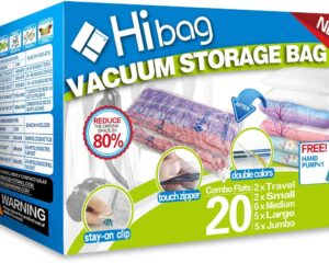 Hibag Space Saver Bags, 20 Pack Vacuum Storage Bags (6 Medium, 5 Large, 5 Jumbo, 2 Small, 2 Roll Up Bags) with Hand Pump for Bedding, Comforter, Pillows, Towel, Blanket, Clothes Roll over image to zoom in Hibag Space Saver Bags, 20 Pack Vacuum Storage Bags (6 Medium, 5 Large, 5 Jumbo, 2 Small, 2 Roll Up Bags) with Hand Pump for Bedding, Comforter, Pillows, Towel, Blanket, Clothes $30.59