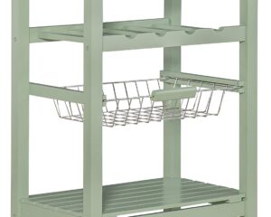 Add much needed storage and prep space to your kitchen with this lovely kitchen cart. The attached wheels make this piece easily mobile, while the wire basket and drawer provide extra storage that every cook needs. The cheerful Green finish and durable granite counter top will brighten up your kitchen and give you the space you need for preparation to entertain guests. Click here for