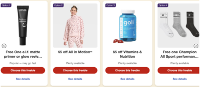 Freebies for Target Circle 360 Members – Through January 31, Target Circle 360 members can choose from a free e.l.f. Matte Primer, $5 off All in Motion, $5 off Vitamins & Nutrition or Free one Champion All Sport Performance Socks. Just add to your cart and the discount will automatically be applied at checkout.